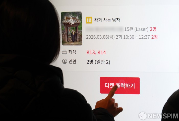 [서울=뉴스핌] 정일구 기자 = 영화 '왕과 사는 남자'가 천만 관객 돌파를 앞둔 가운데 6일 서울 시내 한 영화관에서 관객들이 영화표를 구매하고 있다. 이날 영화진흥위원회 영화관입장권통합전산망에 따르면 영화 '왕과 사는 남자'는 6일까지 누적관객수 977만7998명을 기록해 1000만 돌파까지 22만2002명이 남았다. 2026.03.06 mironj19@newspim.com