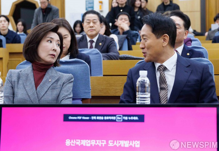 [서울=뉴스핌] 윤창빈 기자 = 나경원 국민의힘 의원, 오세훈 서울시장이 6일 오후 서울 여의도 국회 의원회관에서 열린 용산국제업무지구 '글로벌 허브'인가 '거대 베드타운'인가?' 정책 토론회에서 대화를 하고 있다. 2026.03.06 pangbin@newspim.com