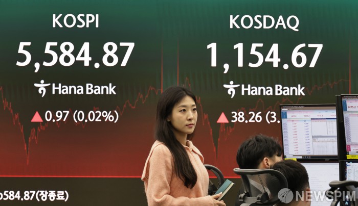 코스닥 매수 사이드카 발동 [서울=뉴스핌] 양윤모 기자= 이란 전쟁 확전 불안감속 6일 오전 코스닥이 전장 종가보다 34.41포인트(3.08%) 상승한 1150.82로 거래를 시작한 가운데, 서울 중구 하나은행 을지로본점 딜링룸에서 직원들이 업무를 보고 있다. 2026.03.06 yym58@newspim.com   2026-03-06 09:41