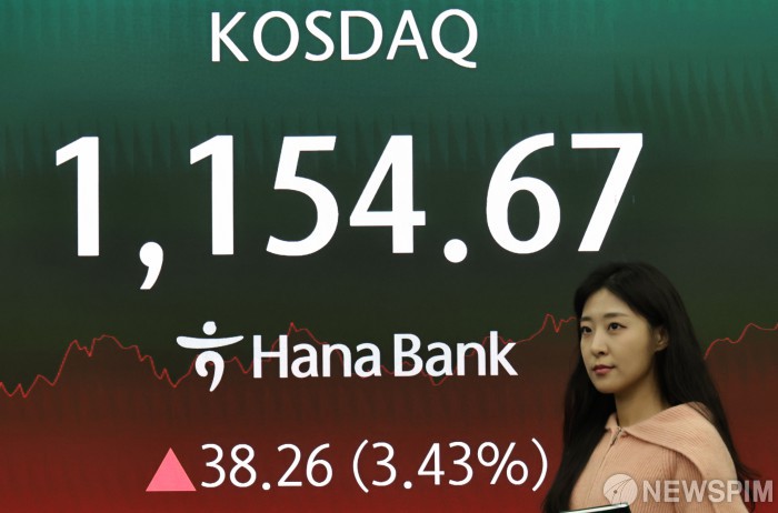 코스닥 매수 사이드카 발동 [서울=뉴스핌] 양윤모 기자= 이란 전쟁 확전 불안감속 6일 오전 코스닥이 전장 종가보다 34.41포인트(3.08%) 상승한 1150.82로 거래를 시작한 가운데, 서울 중구 하나은행 을지로본점 딜링룸에서 직원들이 업무를 보고 있다. 2026.03.06 yym58@newspim.com   2026-03-06 09:41