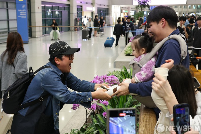 [영종도=뉴스핌] 이형석 기자 = 두바이에 여행을 떠났다 중동 전쟁으로 발이 묶였던 여행객이 6일 인천공항을 통해 귀국하며 가족들과 기뻐하고 있다. 2026.03.06 leehs@newspim.com