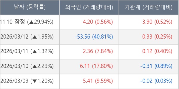 [서울=뉴스핌] 로보뉴스 = 13일 11시 30분 현재 폴라리스오피스(041020)는 외국인과 기관이 각각 4.20 만 주, 3.90 만 주 순매수(잠정) 하면서 전일 대비 29.94% (현재가 5,100원) 상승하고 있다.