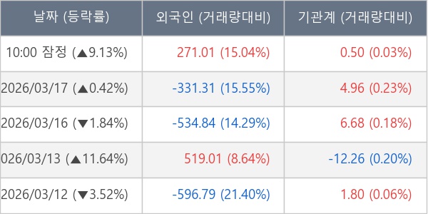 [서울=뉴스핌] 로보뉴스 = 18일 10시 15분 현재 우리기술(032820)은 외국인과 기관이 각각 271.01 만 주, 0.50 만 주 순매수(잠정) 하면서 전일 대비 9.13% (현재가 26,300원) 상승하고 있다.