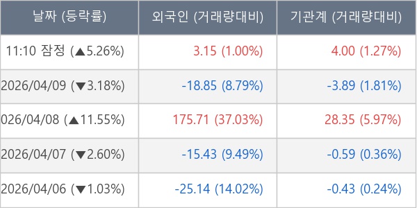 [서울=뉴스핌] 로보뉴스 = 10일 11시 30분 현재 대한전선(001440)은 외국인과 기관이 각각 3.15 만 주, 4.00 만 주 순매수(잠정) 하면서 전일 대비 5.26% (현재가 32,000원) 상승하고 있다.