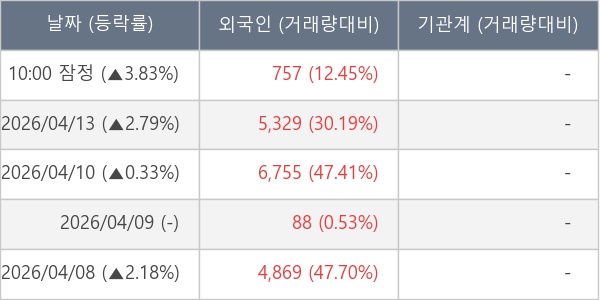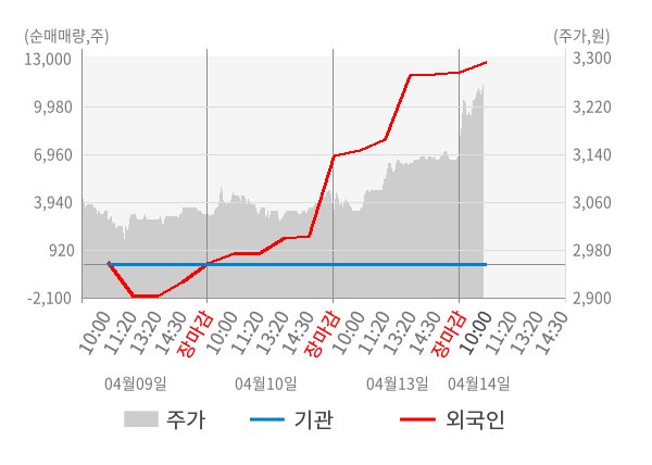[서울=뉴스핌] 로보뉴스 = 14일 10시 15분 현재 와이랩(432430)은 전일 대비 3.83% (현재가 3,255원) 상승했고, 외국인이 최근 6일 연속 순매수(누적 18,607주, 잠정) 행진을 하고 있다.