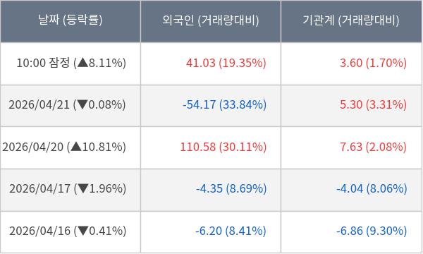 [서울=뉴스핌] 로보뉴스 = 22일 10시 15분 현재 이수페타시스(007660)는 외국인과 기관이 각각 41.03 만 주, 3.60 만 주 순매수(잠정) 하면서 전일 대비 8.11% (현재가 144,000원) 상승하고 있다.