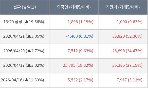 [서울=뉴스핌] 로보뉴스 = 22일 13시 30분 현재 가온전선(000500)은 외국인과 기관이 각각 0.19 만 주, 0.10 만 주 순매수(잠정) 하면서 전일 대비 19.56% (현재가 185,800원) 상승하고 있다.