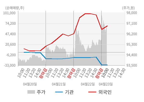 [서울=뉴스핌] 로보뉴스 = 23일 10시 15분 현재 LG(003550)는 전일 대비 1.15% (현재가 96,800원) 상승했고, 외국인이 최근 7일 연속 순매수(누적 11.57만 주, 잠정) 행진을 하고 있다.