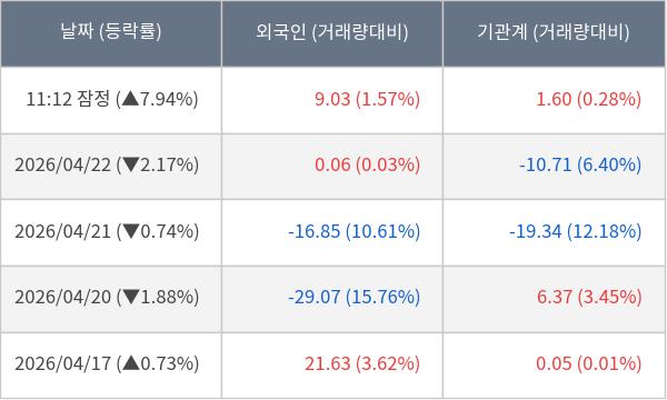 [서울=뉴스핌] 로보뉴스 = 23일 11시 30분 현재 덕산하이메탈(077360)은 외국인과 기관이 각각 9.03 만 주, 1.60 만 주 순매수(잠정) 하면서 전일 대비 7.94% (현재가 17,000원) 상승하고 있다.