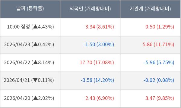 [서울=뉴스핌] 로보뉴스 = 24일 10시 15분 현재 오픈엣지테크놀로지(394280)는 외국인과 기관이 각각 3.34 만 주, 0.50 만 주 순매수(잠정) 하면서 전일 대비 4.43% (현재가 20,050원) 상승하고 있다.