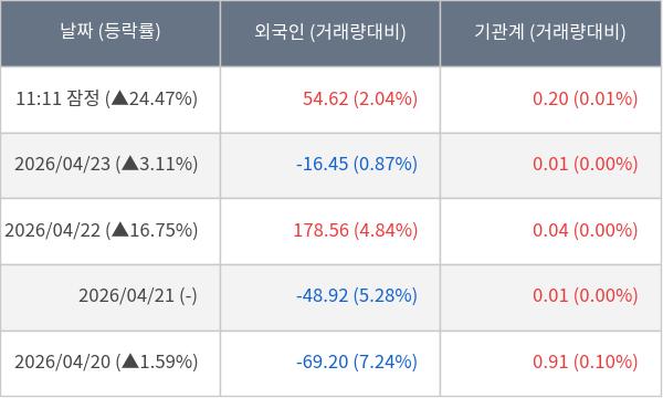 [서울=뉴스핌] 로보뉴스 = 24일 11시 30분 현재 아주IB투자(027360)는 전일 대비 24.47% (현재가 18,160원) 상승했고, 기관이 최근 5일 연속 순매수(누적 11,631주, 잠정) 행진을 하고 있다.