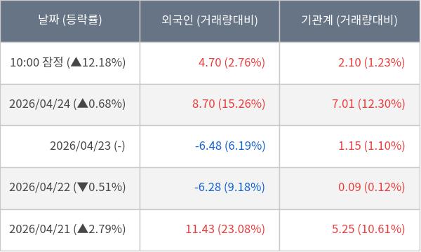 [서울=뉴스핌] 로보뉴스 = 27일 10시 15분 현재 한미반도체(042700)는 전일 대비 12.18% (현재가 331,500원) 상승했고, 기관이 최근 5일 연속 순매수(누적 15.61만 주, 잠정) 행진을 하고 있다.
