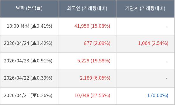 [서울=뉴스핌] 로보뉴스 = 27일 10시 15분 현재 해성산업(034810)은 전일 대비 9.41% (현재가 8,600원) 상승했고, 외국인이 최근 10일 연속 순매수(누적 73,754주, 잠정) 행진을 하고 있다.
