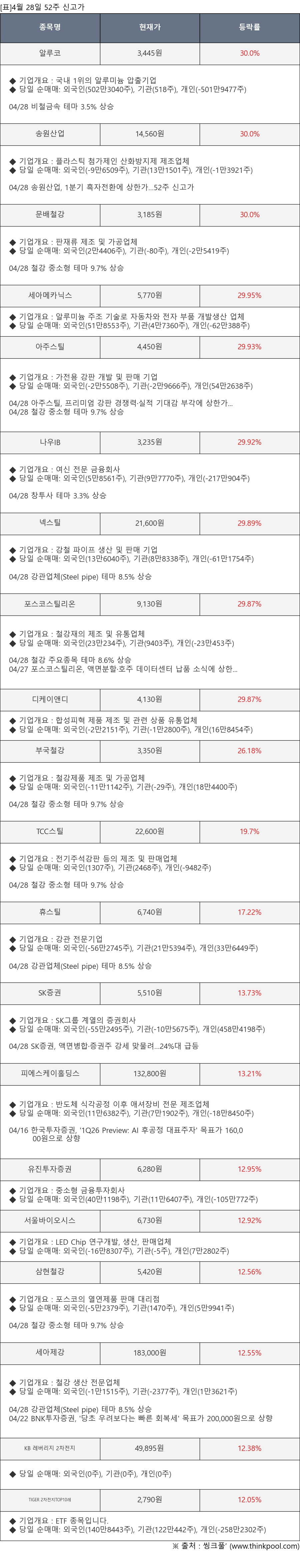[서울=뉴스핌] 로보뉴스 = 4월 28일, 인공지능 투자비서 ‘AI라씨로’가 알루코(001780), 송원산업(004430) 등 52주 신고가가 발생한 종목들에 대한 최근 동향을 분석했다.