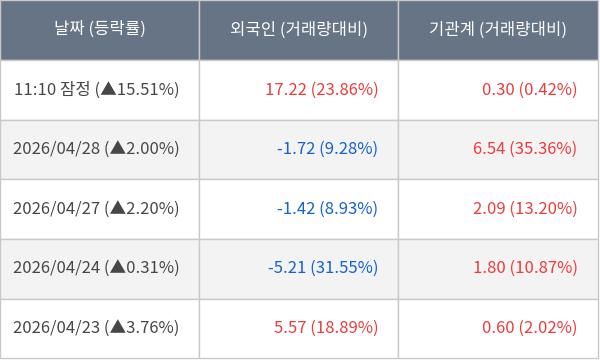 [서울=뉴스핌] 로보뉴스 = 29일 11시 30분 현재 싸이맥스(160980)는 전일 대비 15.51% (현재가 38,350원) 상승했고, 기관이 최근 18일 연속 순매수(누적 51.09만 주, 잠정) 행진을 하고 있다.