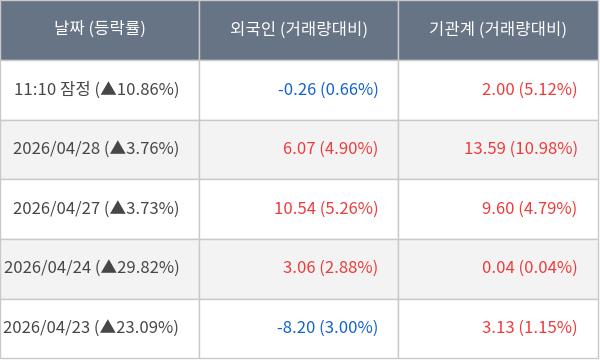 [장중수급포착] 피엠티, 기관 5일 연속 순매수행진... 주가 +10.86%