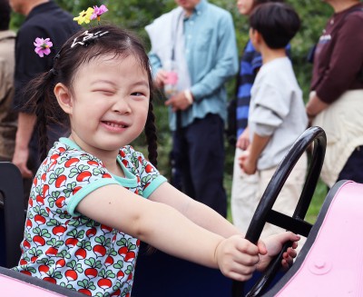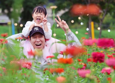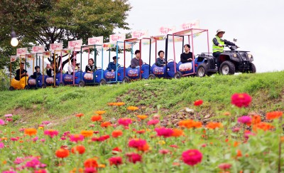 내년을 기약하며 깡통열차 타고 백일홍 꽃밭 즐기는 방문객