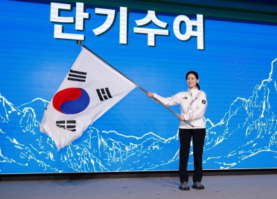 단기 흔드는 이수경 2026 밀라노 동계올림픽 선수단장
