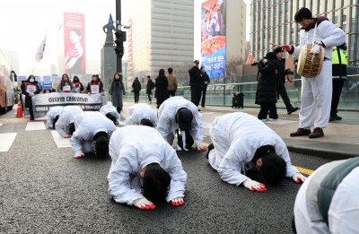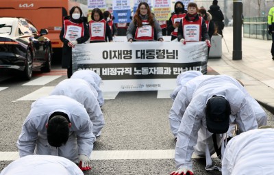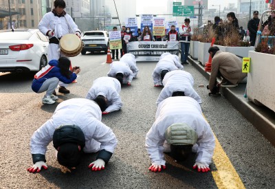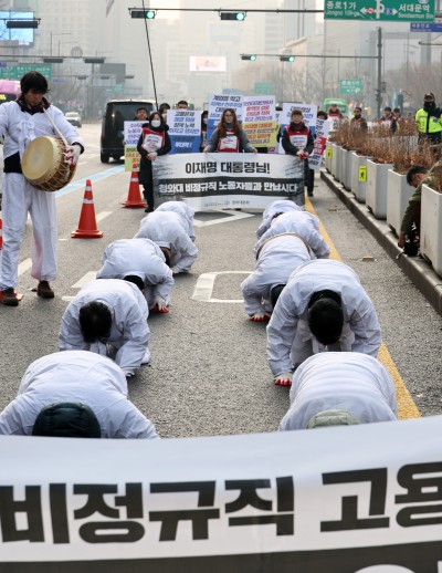 '해고위기' 청와대 비정규직 노동자, 청와대 행진하며 삼보일배