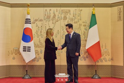 서로의 손 잡은 이재명 대통령 - 조르자 멜로니 이탈리아 총리