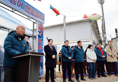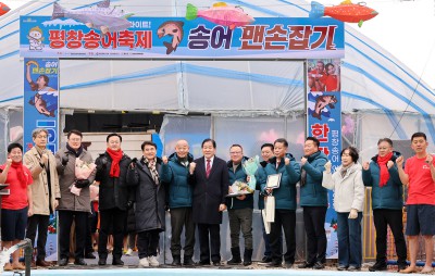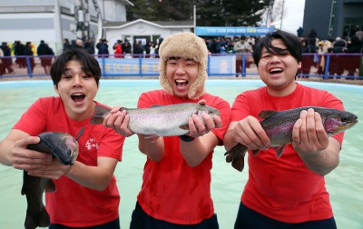 송어맨손잡기 체험 도전한 장문혁 축제위원장과 심현정 평창군의원