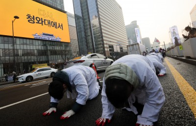 '해고위기' 청와대 비정규직 노동자, 청와대 행진하며 삼보일배