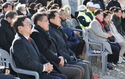 추위속 '진접차량기지' 이전 영상물 관람하는오세훈 서울시장과 오승록 노원구청장