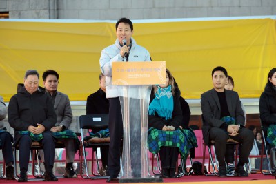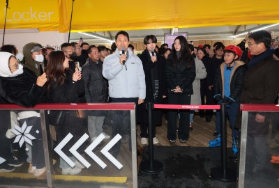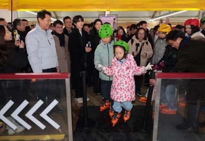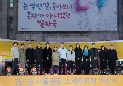 서울광장 스케이트장 입장객 맞는 오세훈 서울 시장 과 차준환, 심석희 선수