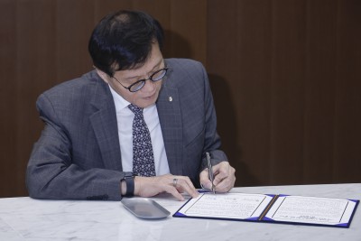 공식적인 행사에 주머니에 손넣고 환영사하는 송정수 한국전파진흥협회 상근 부회장