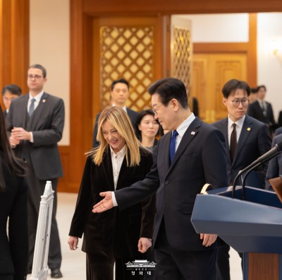 함께 이동하는 이재명 대통령 - 조르자 멜로니 이탈리아 총리